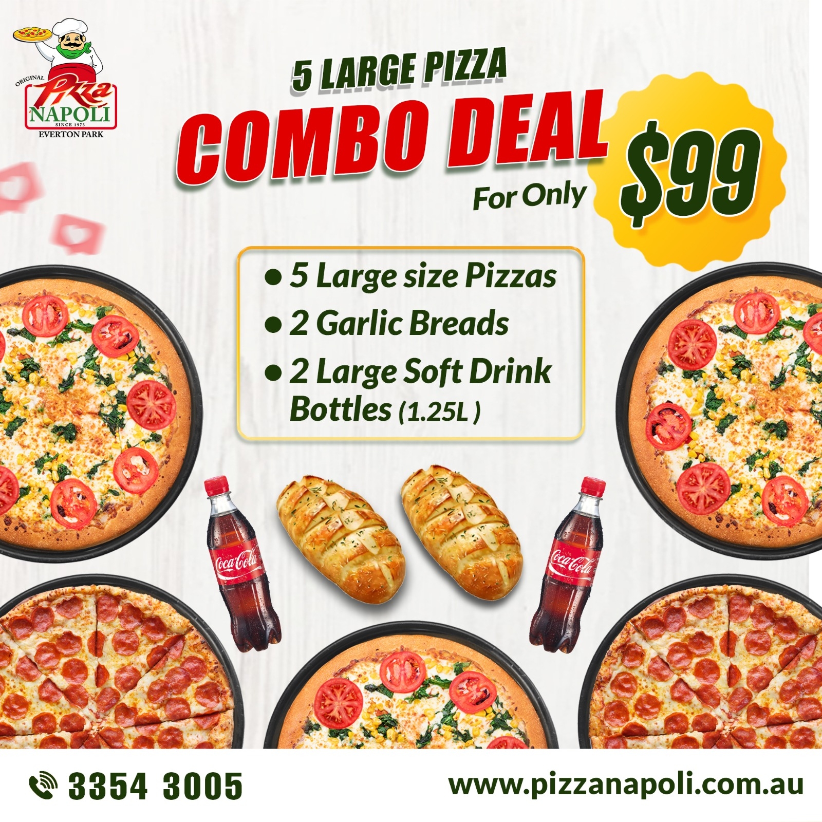 For just $99, you get: - 5 Large Gourmet Pizzas (Choose from 21 irresistible options!) - 2 Large Garlic Breads - 2 Large 1.25L Soft Drinks