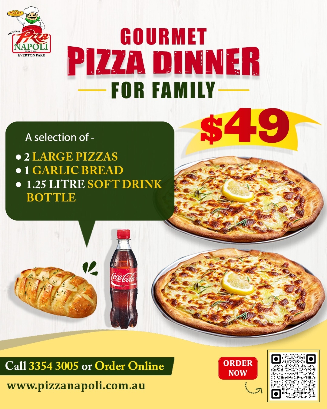 Get 2 large Gourment Pizzas with a Garlic bread and a softdrink bottle for $49