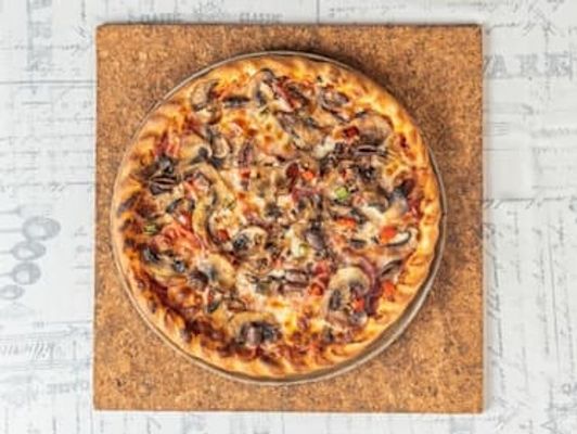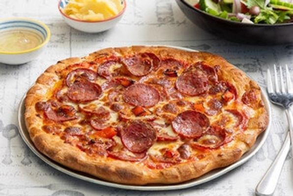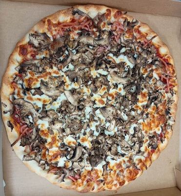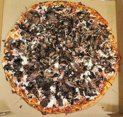 Cheese, ham, mushrooms, garlic, capsicum, pepperoni, bacon and onion
