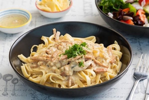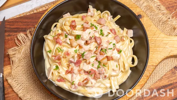 Cream sauce, bacon, mushroom, onion and parsley. (Parmesan cheese included at no extra cost)