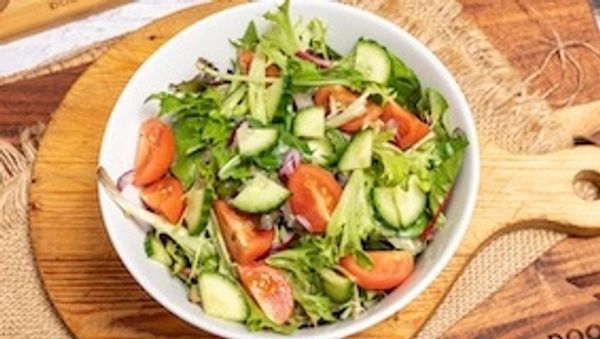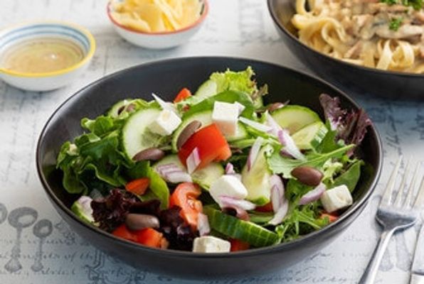 Baby leaf salad mix with cucumbers, fresh tomatoes, salad onions, kalamata olives, fetta cheese and a greek dressing.