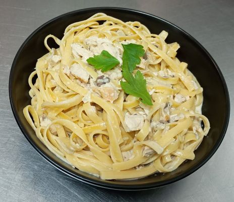 Chicken (diced & cooked in house), Onion, Mushrooms, culinary cream, garlic, pepper
