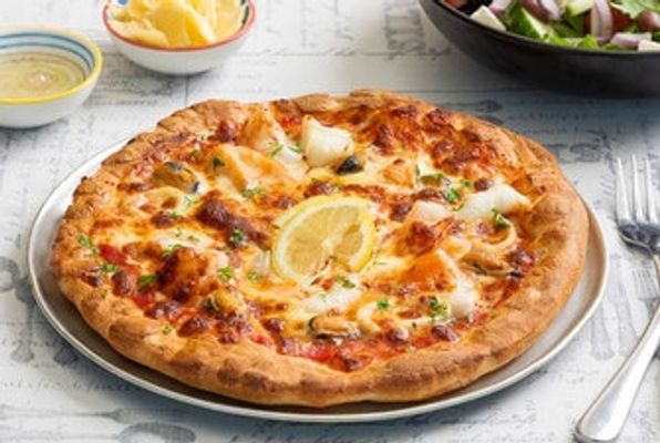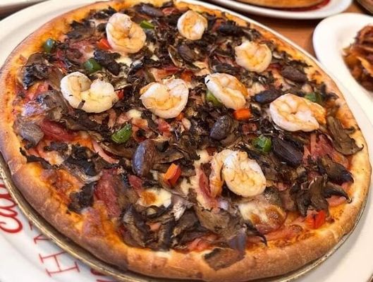 Italian supreme with prawns. (Cheese, ham, mushrooms, garlic, olives, capsicum, pepperoni and prawns)